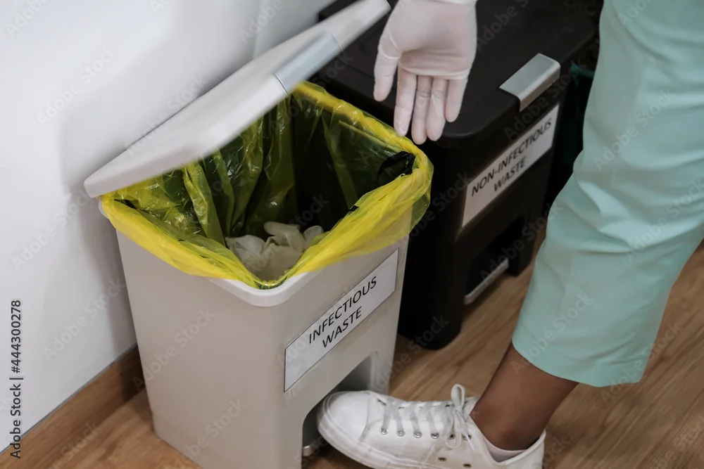 Hospital worker discarding infectious medical waste into disposal container bin. Close up of biohazard contaminated clinical waste