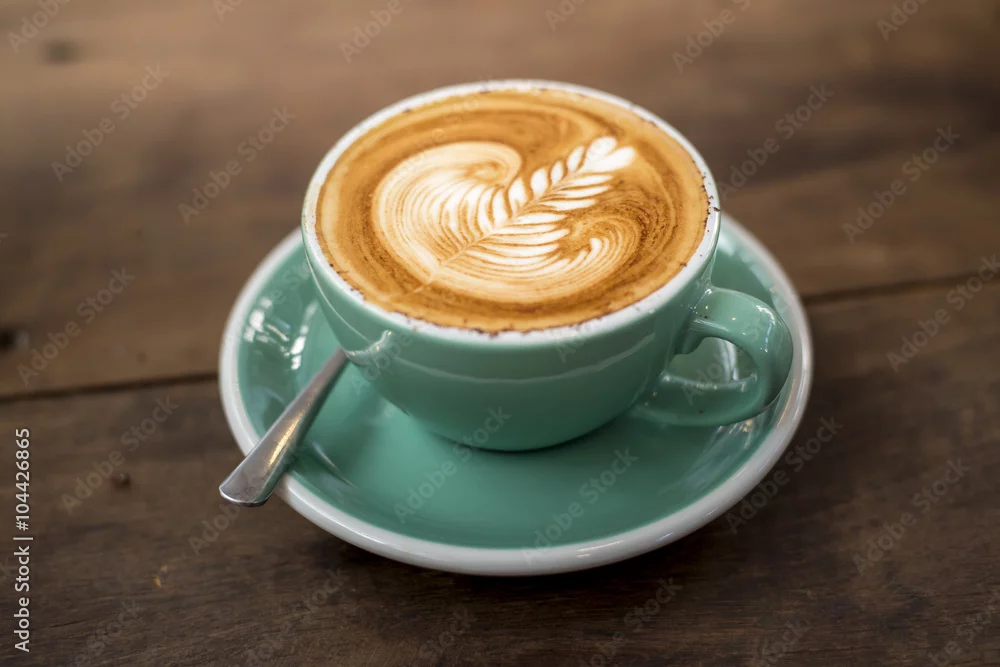 hot cappuccino with latte art on wood background