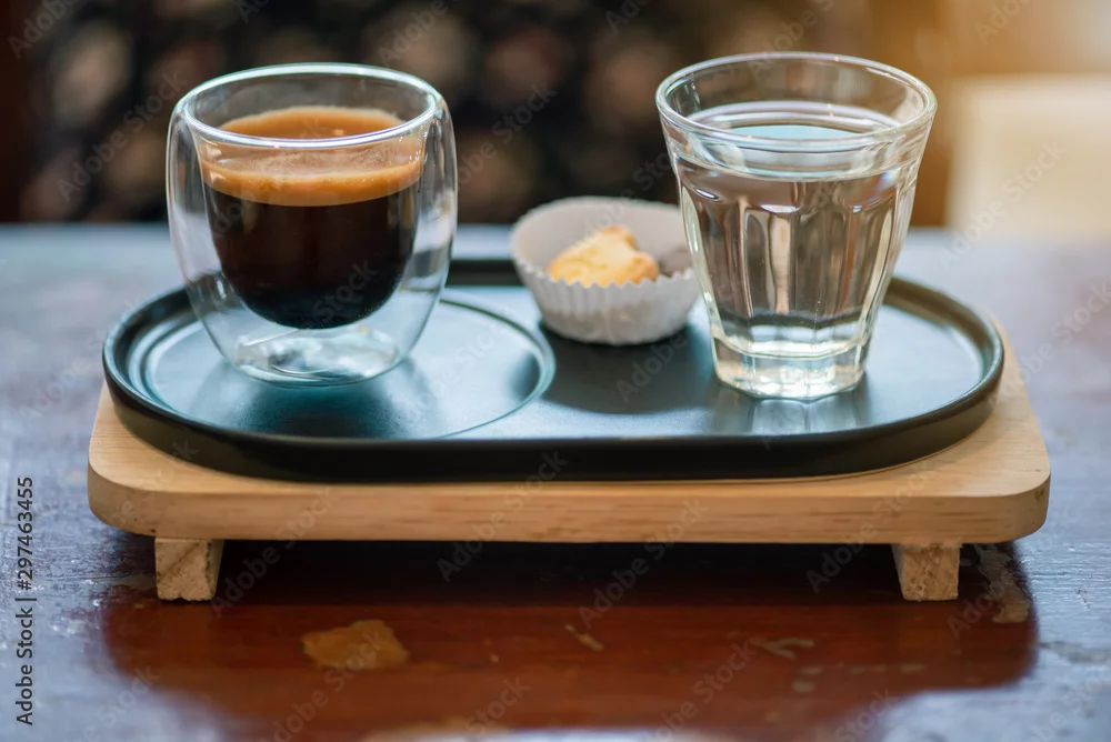 Hot espresso coffee in a clear glass, placed on a metal tray and wooden layer beside the coffee cup with a bear shaped cookie . All laid on dark brown wooden tables in retro coffee shop.