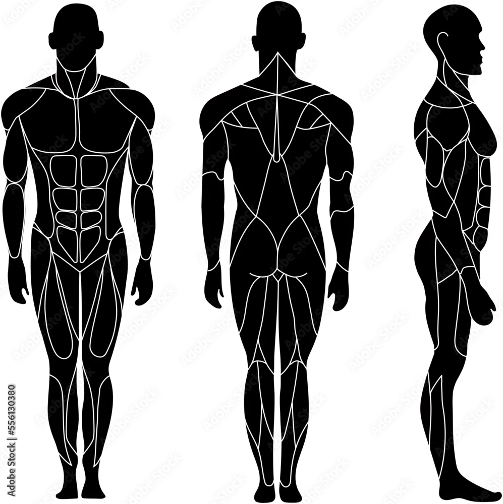 Human body, muscular system, human anatomy, front view, back view, side view. Outline white