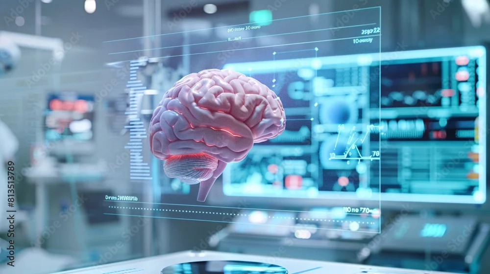 Human brain with x-ray image on computer screen. Technology and science concept.