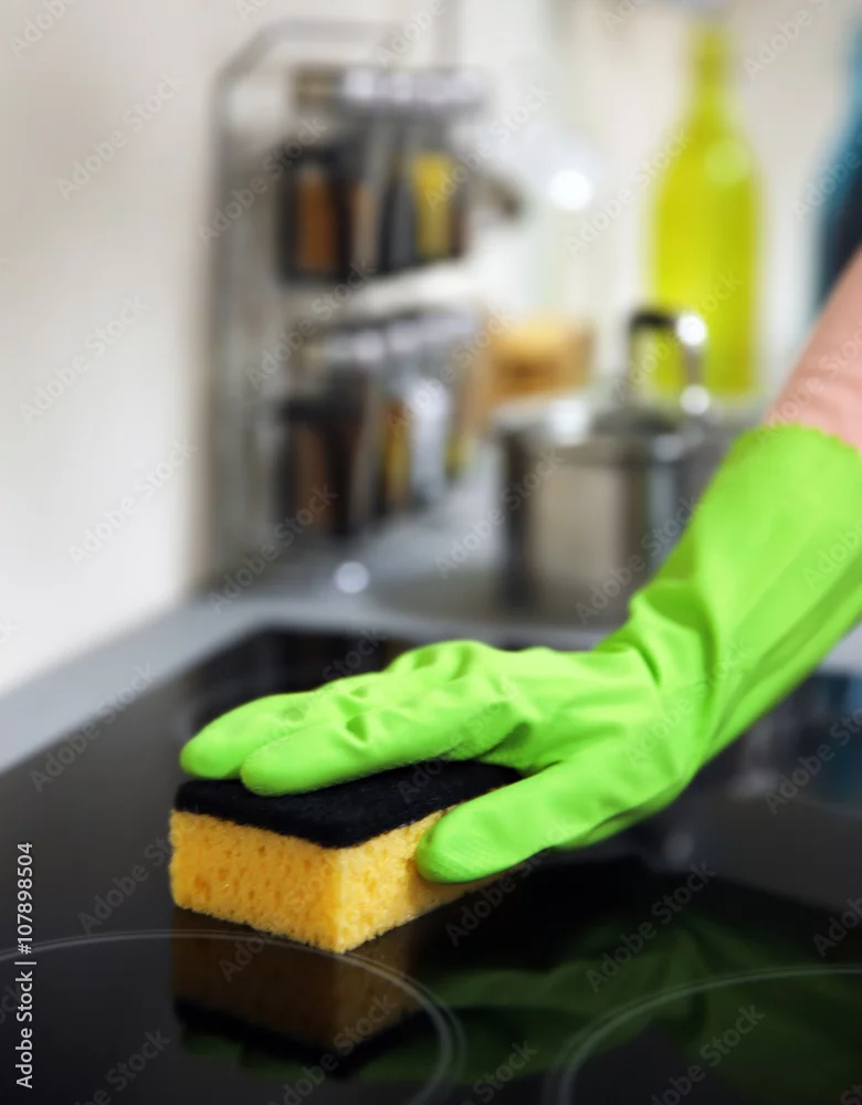 Human hand in protective gloves washing electric hob in the kitchen
