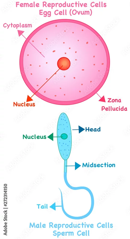 Human reproductive cells. Female cell ovum or egg, male cell sperm anatomy. Reproduction system in humans and animals. Simple annotated. White background. ...