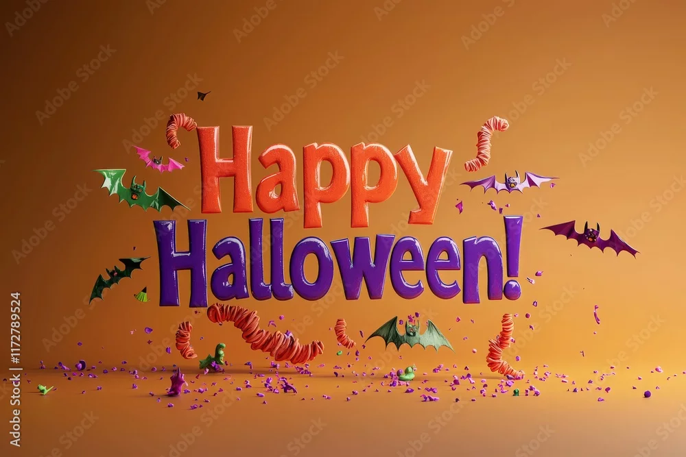 Bright and playful Halloween greeting showcases the words Happy Halloween in bold colors surrounded by playful decorations like bats and candy worms, perfect ...