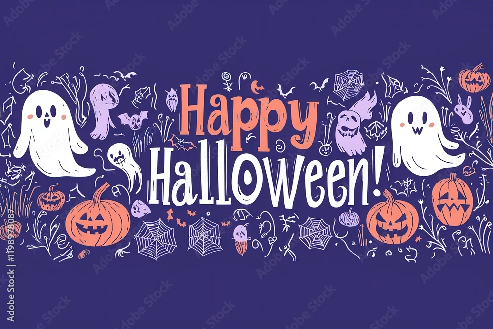 A colorful Halloween greeting features whimsical ghosts, carved pumpkins, and spooky elements on a vibrant purple backdrop. Perfect for celebrating the festive spirit of Halloween.