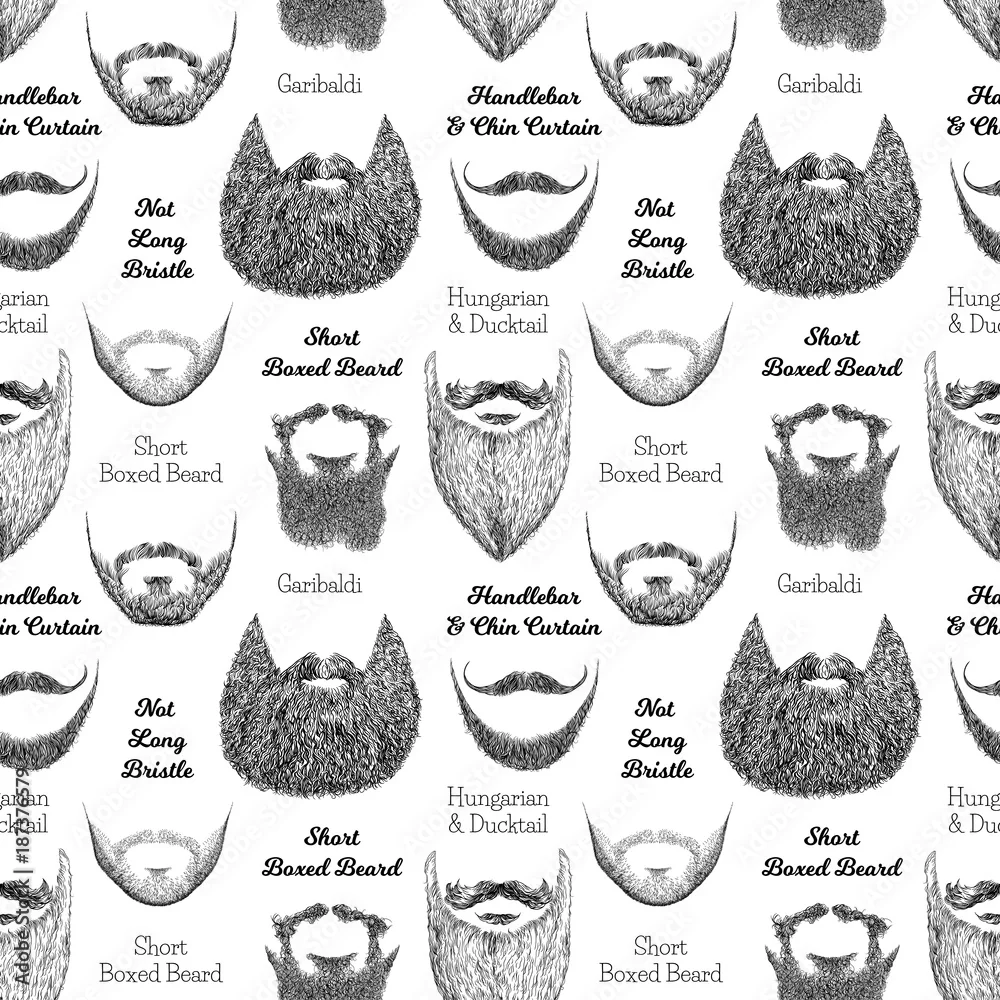 Seamless pattern with beards and mustaches. Hand drawn illustration with fashionable men's styles. Linear Graphics. Kinds and names of hairstyles