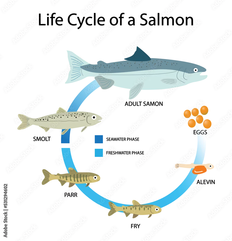 illustration of animals and biology, Life cycle of a Salmon, salmons have an average lifespan of 7 years, salmons comprises six stages, egg, alevin, fry, parr, smolt, and adult
