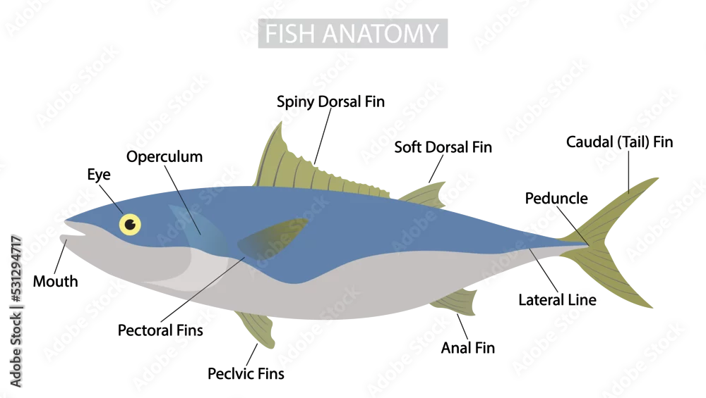 illustration of biology and animals, morphology of fish, fish body is composed mainly of a large lateral muscle on each side of the backbone, External Anatomy