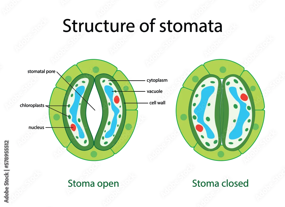 illustration of biology, Stomata opening and closing vector illustration. Labeled educational scheme, Structure of stomatal complex with open and closed ...