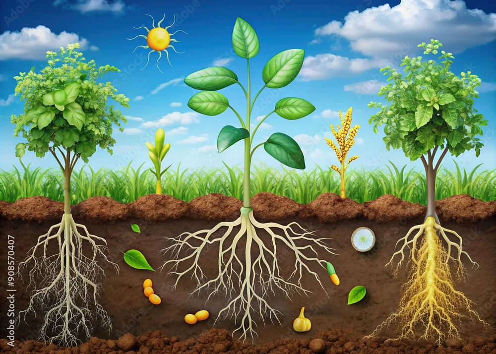 Illustration of nitrogen cycle in soil, depicting symbiotic relationship between nitrogen-fixing bacteria and plant roots, highlighting nutrient exchange ...