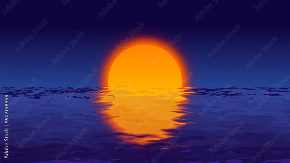 Illustration of sunset on sea beach cartoon style retro wallpaper. Vintage image of orange sun over water reflects on sea waves surface in high 8k resolution