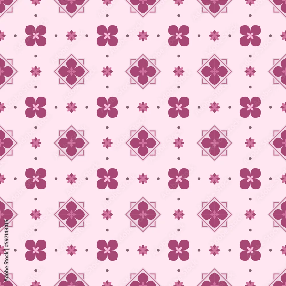 In this seamless pattern, an orderly arrangement various sizes of flower graphics is arranged. Add circles dots on a background that is in the same tone as the flower.