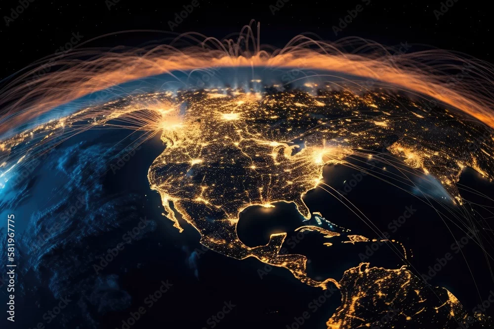 incredibly intricate planet Earth at night, with the rising sun and city lights illuminating it. A light network that represents the main aviation routes on Earth is based on actual data. Generative