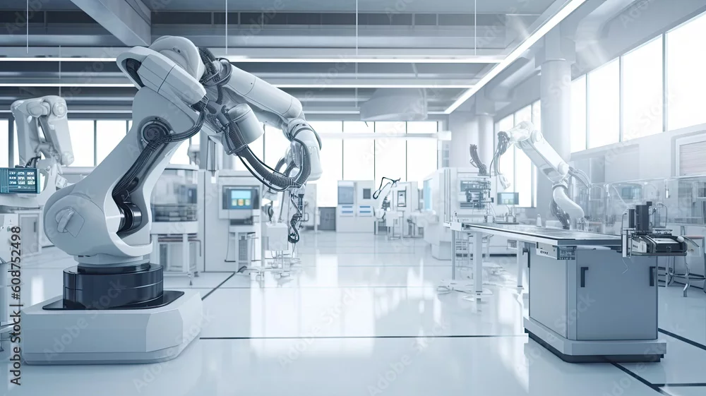 Industrial robotic welding and robot gripping working on smart factory, on machine blue tone color background, industry 4.0 and technology. Generative ...