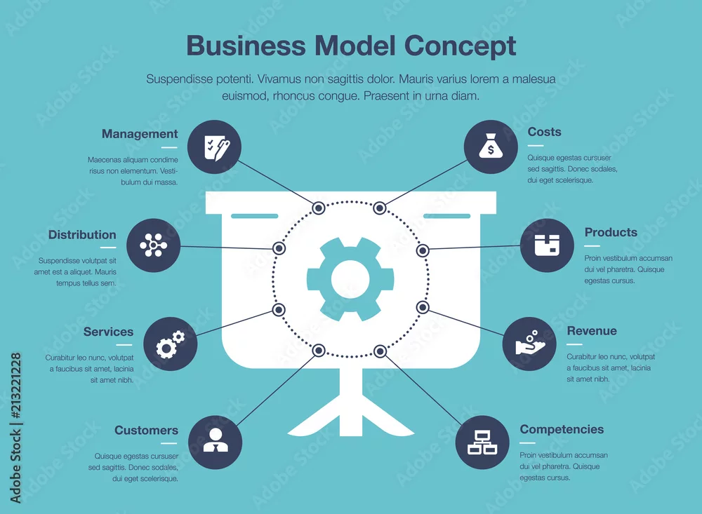 Infographic for business model visualization template with presentation board and gear as main symbol, isolated on blue background. Easy to use for your ...