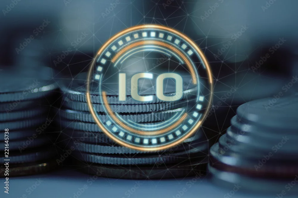 Initial Coin Offering (ICO) hologram hover over pile of regular coins. Illustration of solution to new economic system concept. For promoting new coin tokens and crypto currency