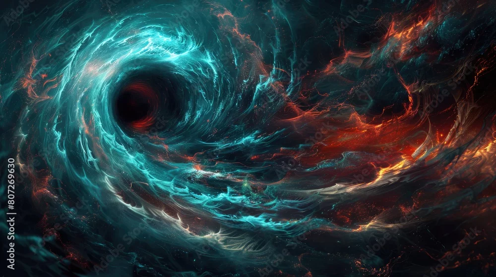 Intense and dynamic cosmic whirlpool with a blend of fiery red and cool blue colors, depicting powerful energy.