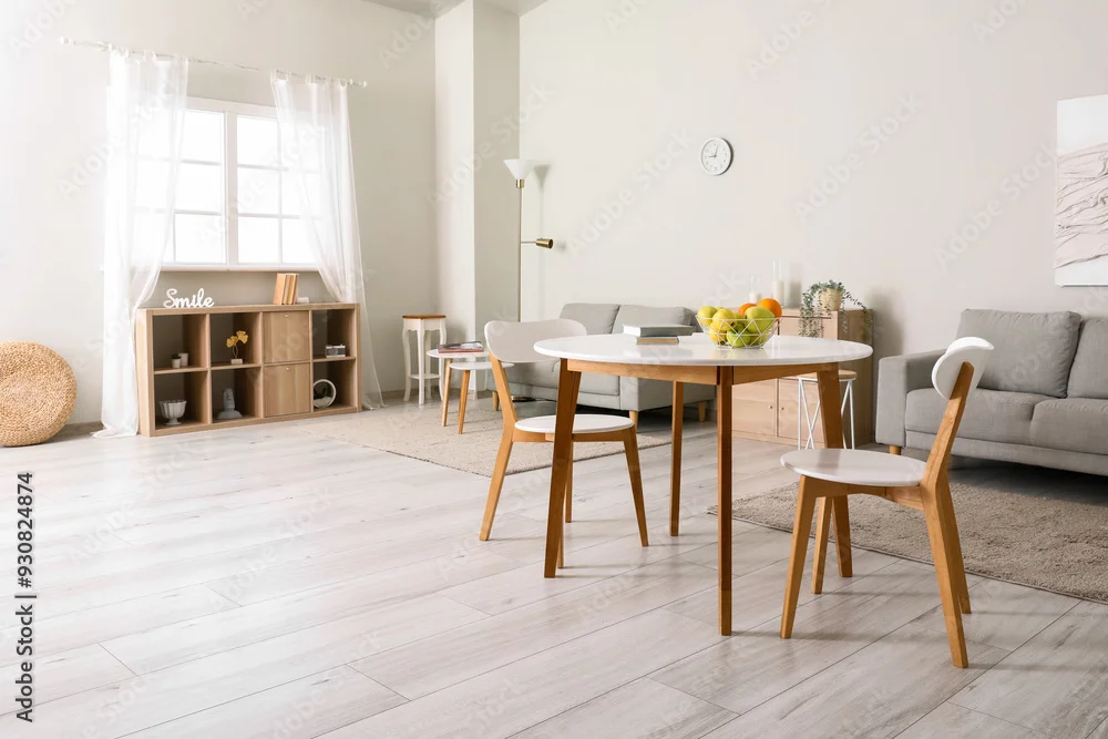 Interior of light room with dining table and sofas