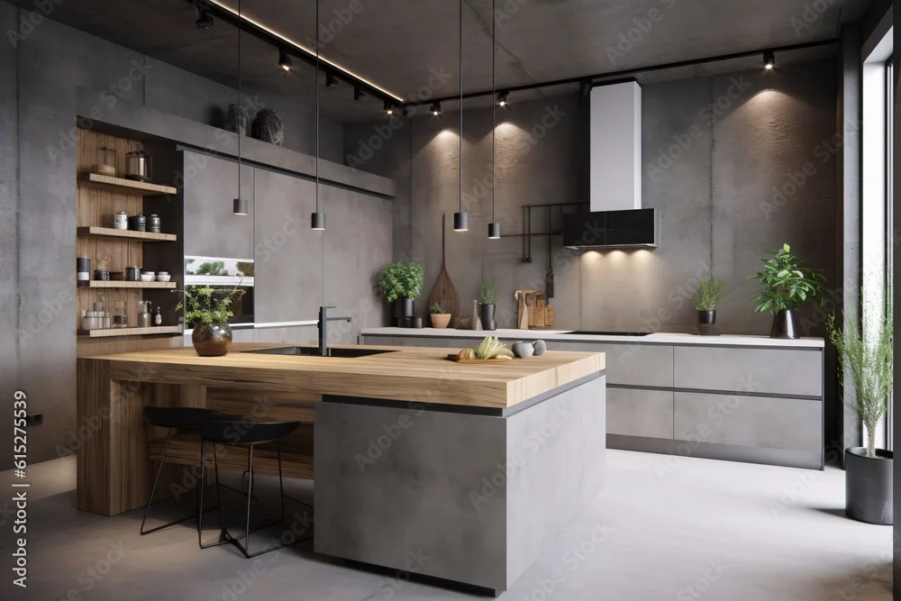 Interior of modern kitchen with gray walls, concrete floor, gray countertops and wooden cupboards. Industrial, concrete or loft Style. created with Generative AI