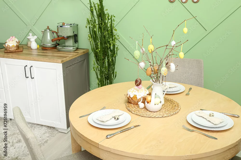 Interior of modern kitchen with table served for Easter celebration