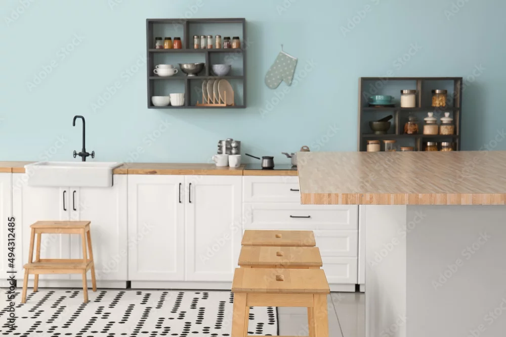 Interior of stylish kitchen with white counters, shelves and supplies