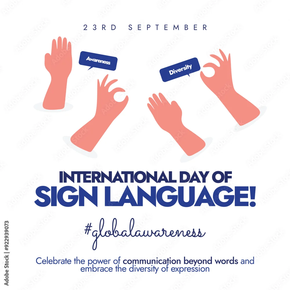 International Day of Sign Language background, post. 23rd September Sign language day banner with hands making different signs. The day raise awareness ...