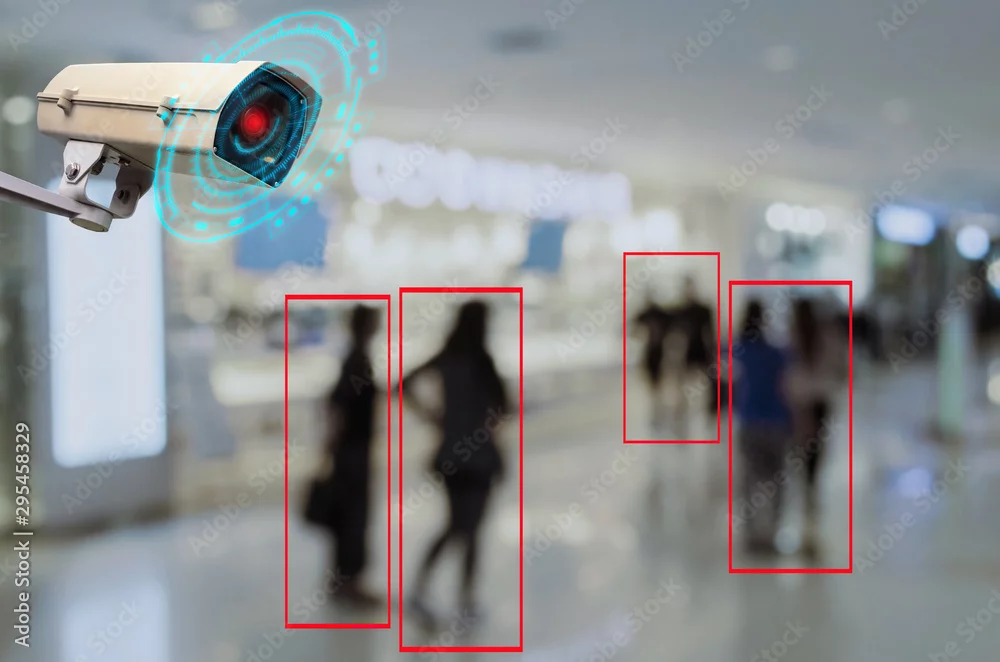 IOT CCTV, security indoor camera motion detection system operating with people shopping at shopping mall, cctv solution management system, surveillance security, safety intelligent technology concept