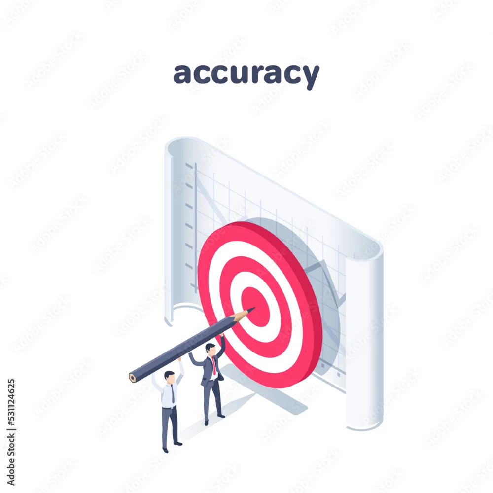 isometric vector illustration on a white background, accuracy and success, people in business clothes put a pencil in the center of the target on a sheet ...