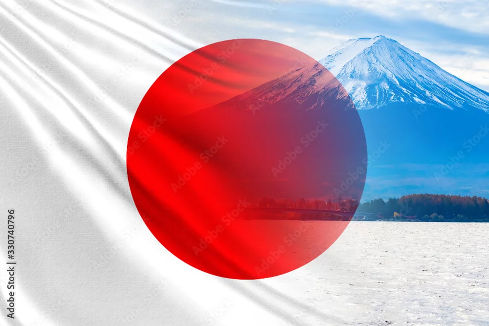 Japan. Mount Fuji on the background of the flag of Japan. Attractions In Japan. Nature of Asian countries. Travel to East Asia. Famous mountain. Province ...