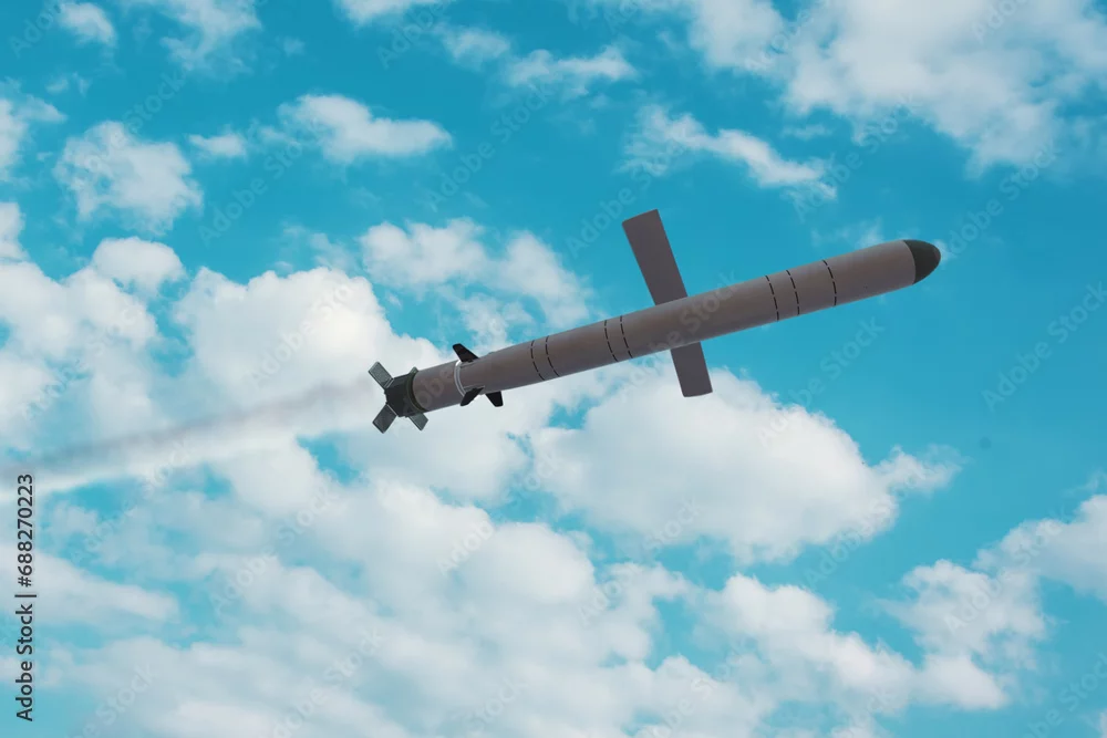 Kalibr cruise missile flies in the sky, smoke trail from the launch of the missile. Concept: war in Ukraine, Russian missile attack, airborne Subway.