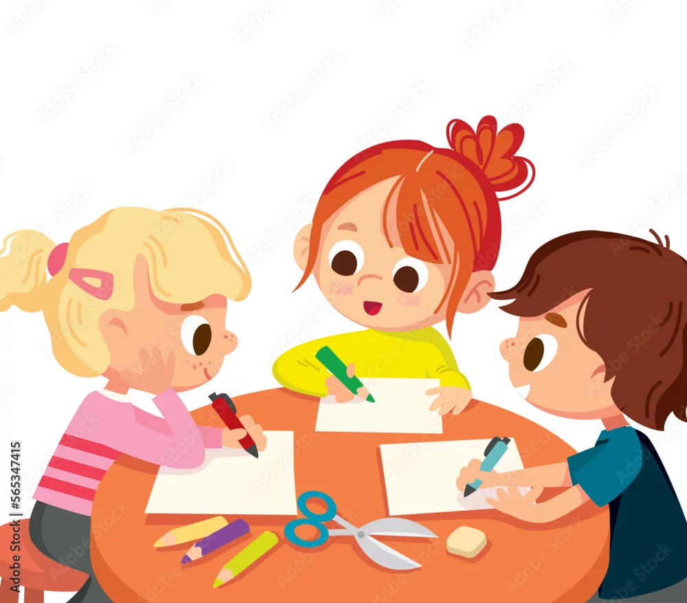 Kids learn how to draw. Little children, babies drawing pictures with pencils and markers on blank sheets sitting around the table. Drawing kid activity in art class.Creative Arts and Crafts Classes.