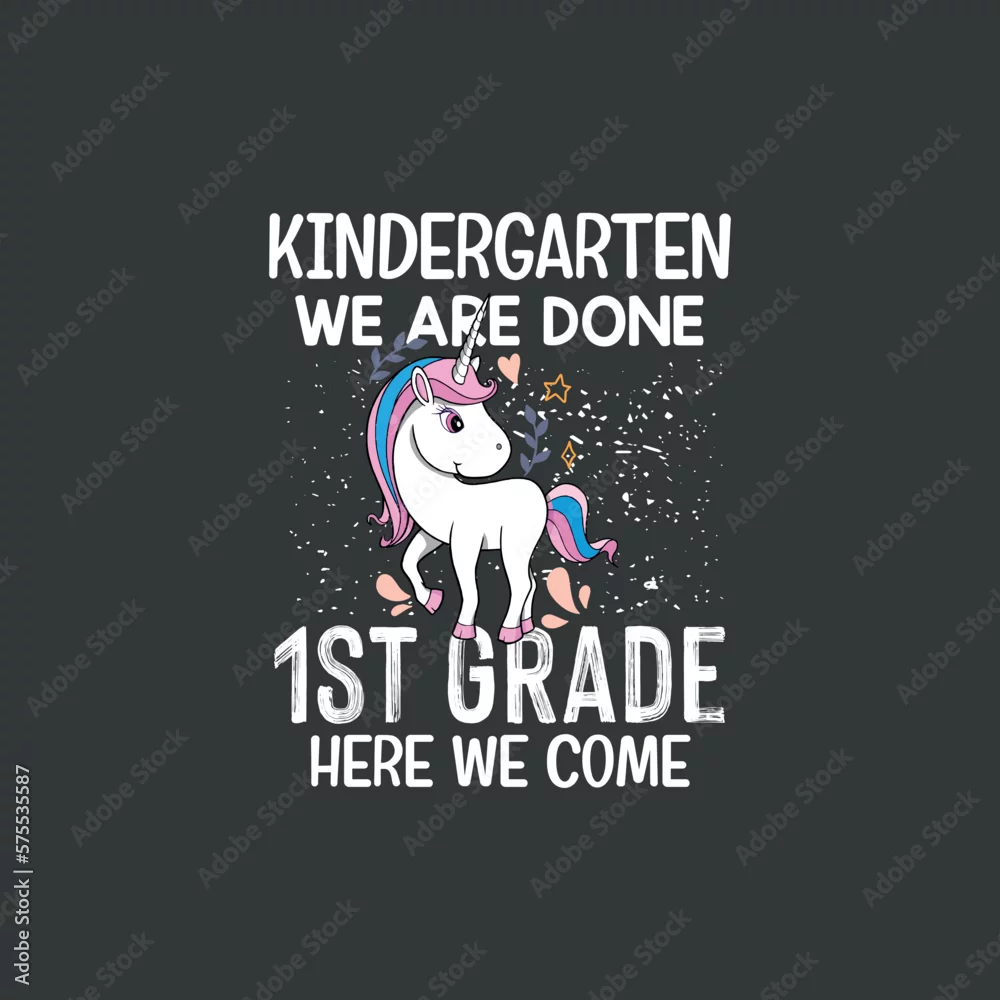 kindergarten we are done 1st grade here we come t shirt design vector, unicorn, 1st grade,school, back to school,funny, saying, vector, editable eps, instant uploadable,funny, saying, vector, editable