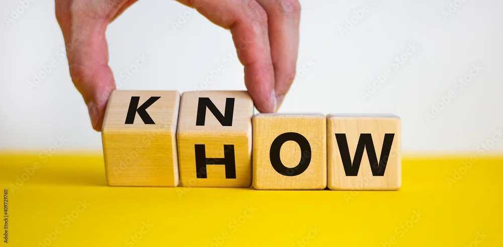 Know how symbol. Businessman turns cubes and changes the word 'how' to 'know'. Beautiful yellow table, white background. Copy space. Business and know ...