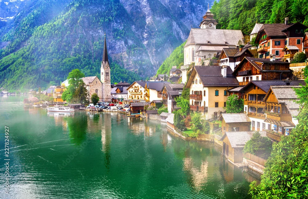 Landmarks of Austria - emerald lake and beautiful village Halstatt in Austrian Alps