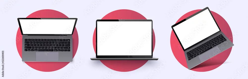 Laptop frame less blank screen. Realistic laptop in different positions, angle. Mockup generic device. Telephone frame with blank display isolated. Realistic ...