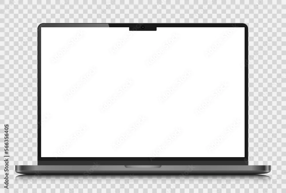 Laptop layout with reflection on a transparent background. A realistic laptop with a dark silver case and a white screen. Vector EPS 10.