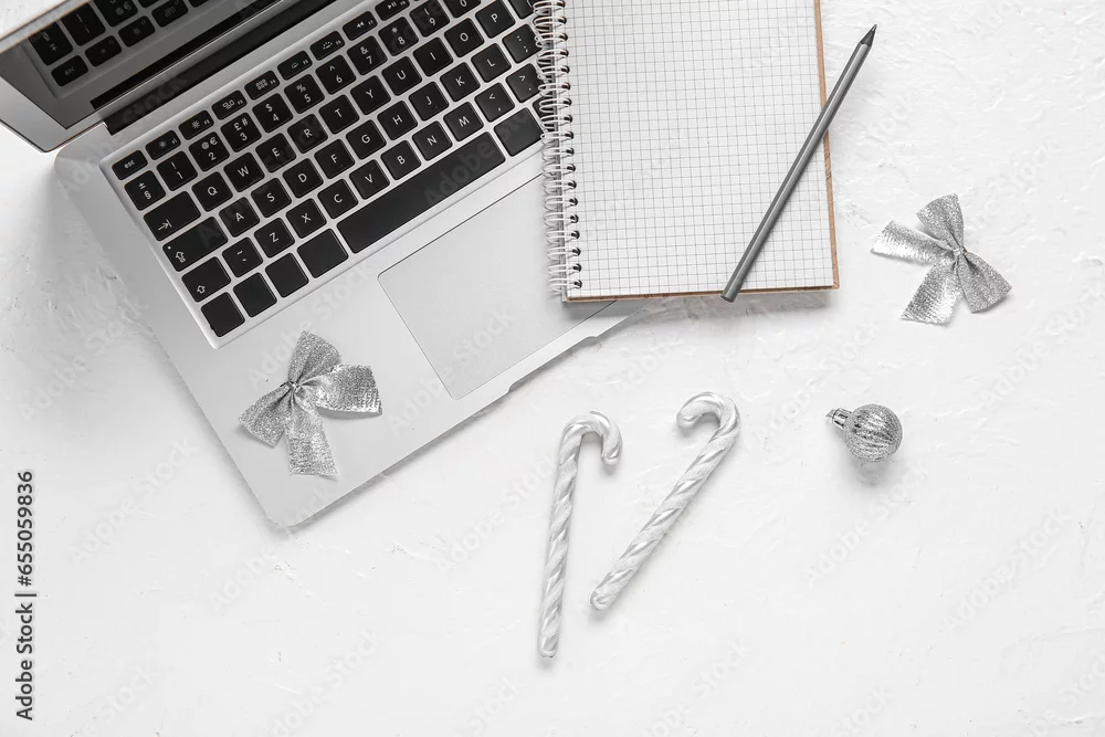 Laptop with notebook and Christmas decor on white background