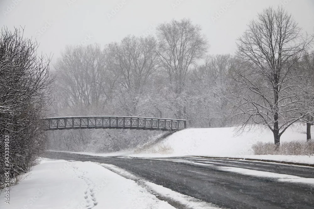 Last snow storm in April with cold, wind and large snow flakes near Minneapolis Minnesota