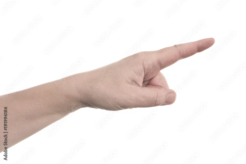 Left hand pointing index finger shows to the top right - human hand gesture isolated on white background with copyspace