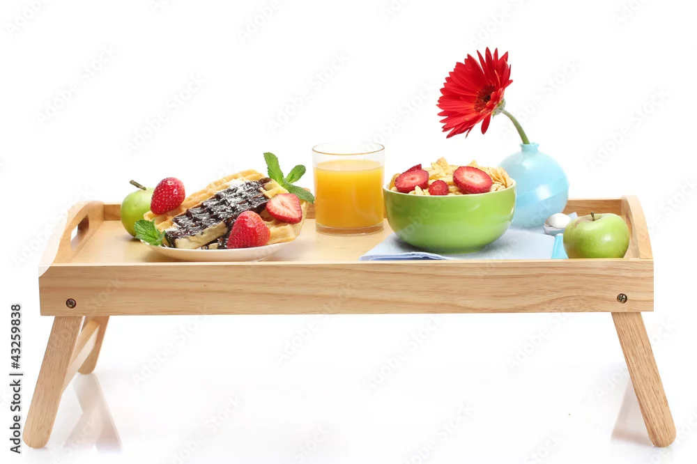 light breakfast on wooden tray isolated on white