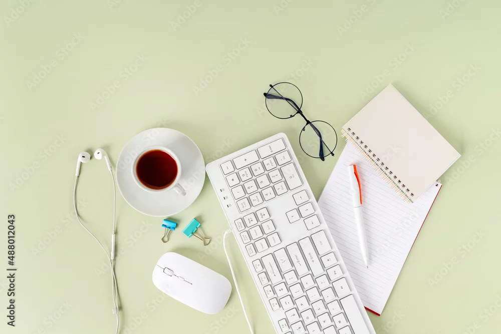 Light green office desk, minimalist style desk with keyboard, tea mug and glasses, copy space, top view, flat layout, layout