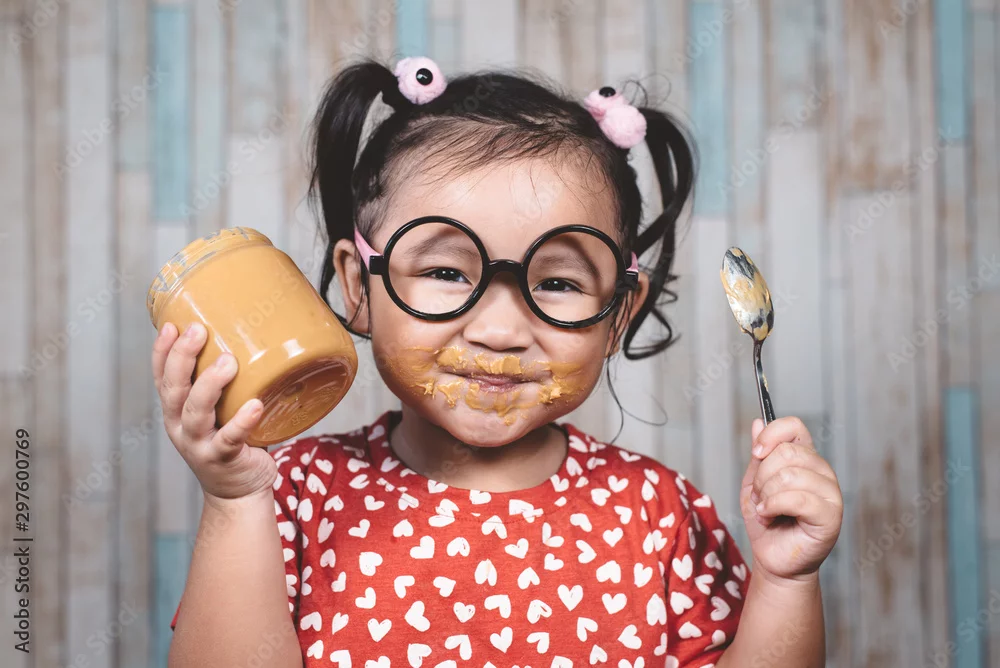 little asian girl holding and enjoying peanut butter in jar and a spoon, Concept of peanut butter lover
