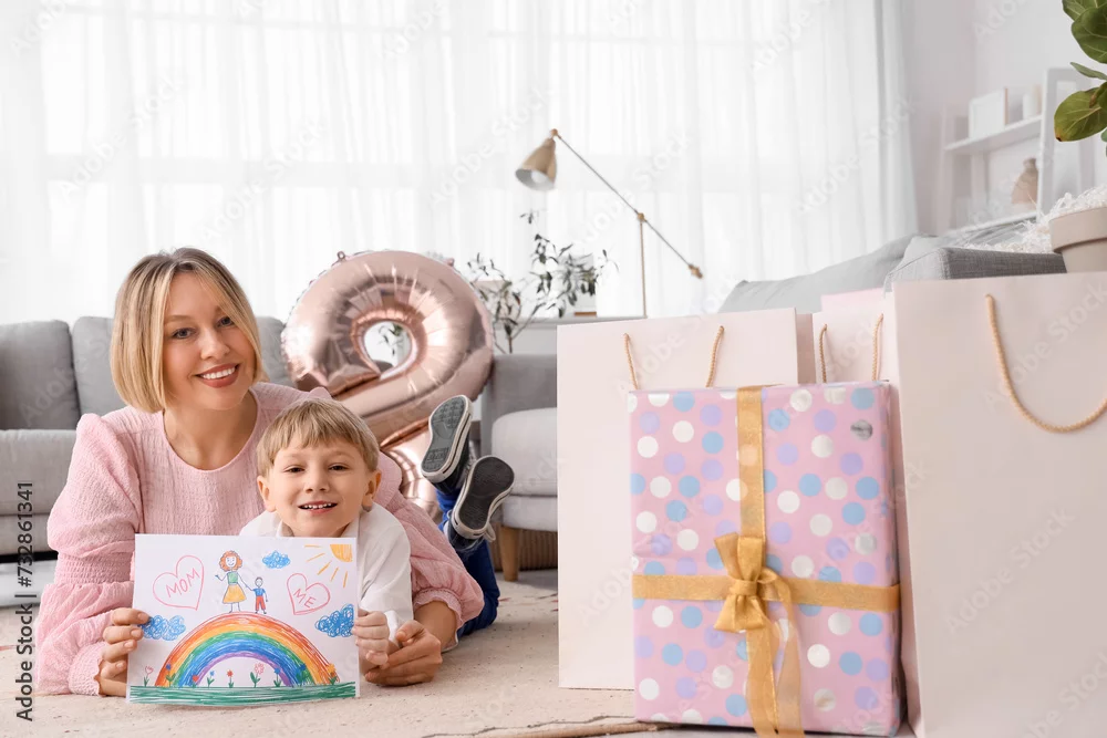 Little boy with drawing for his mother lying on floor at home. International Women's Day