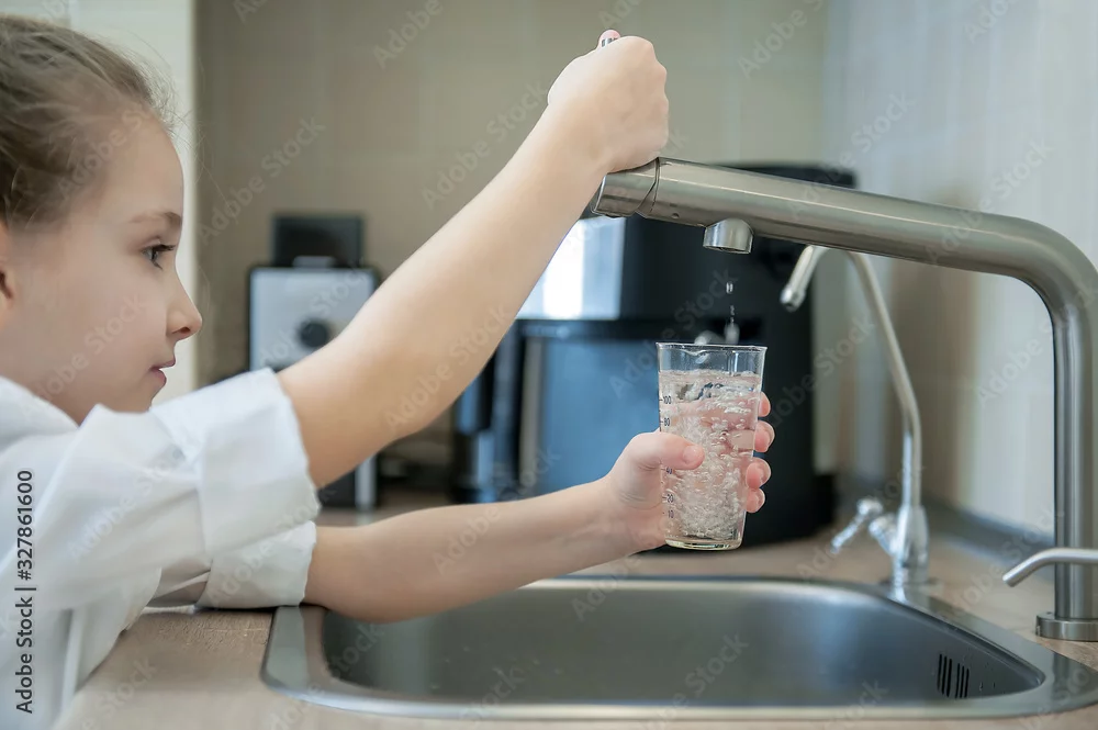 Little girl open a water tap with her hand holding a transparent glass. Kitchen faucet. Filling cup beverage. Pouring fresh drink. Hydration. Healthcare. Healthy lifestyle. World water day