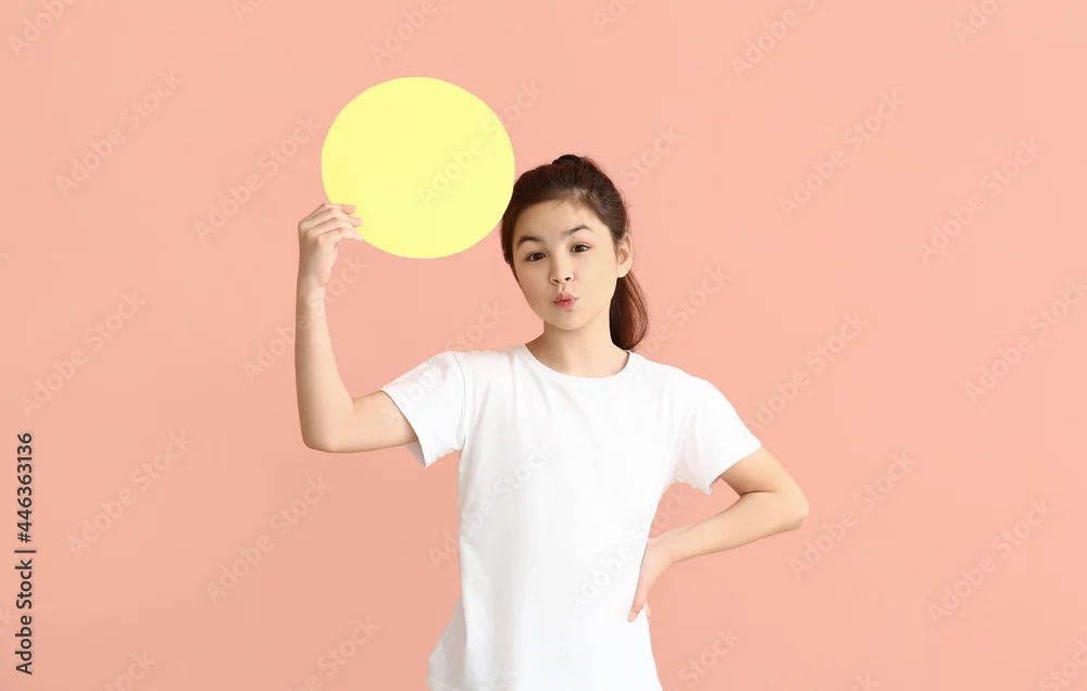 Little girl with blank paper sheet on color background