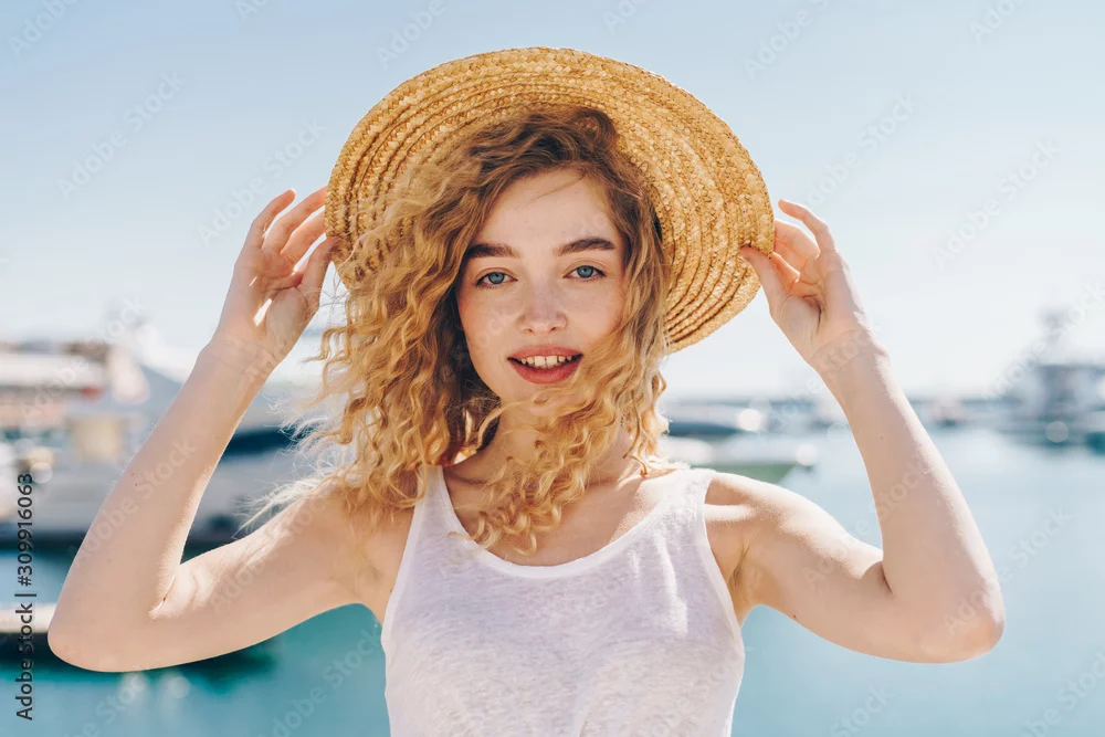 lovely girl with doll beauty holds a hat on her head with two hands on the background of ships and the ocean