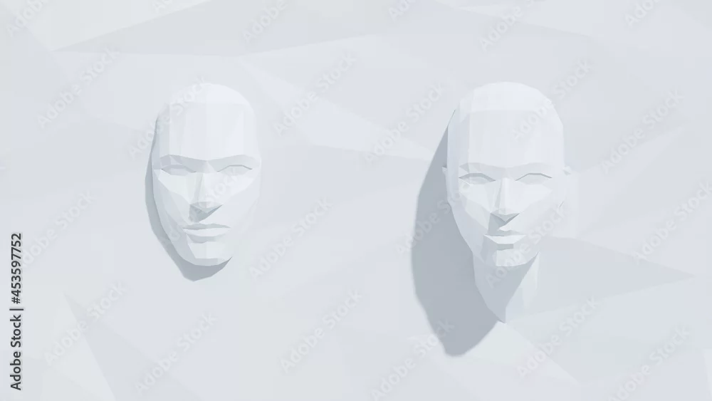 Low poly human faces in white polygon background. 3d rendering animation simple illustration style.