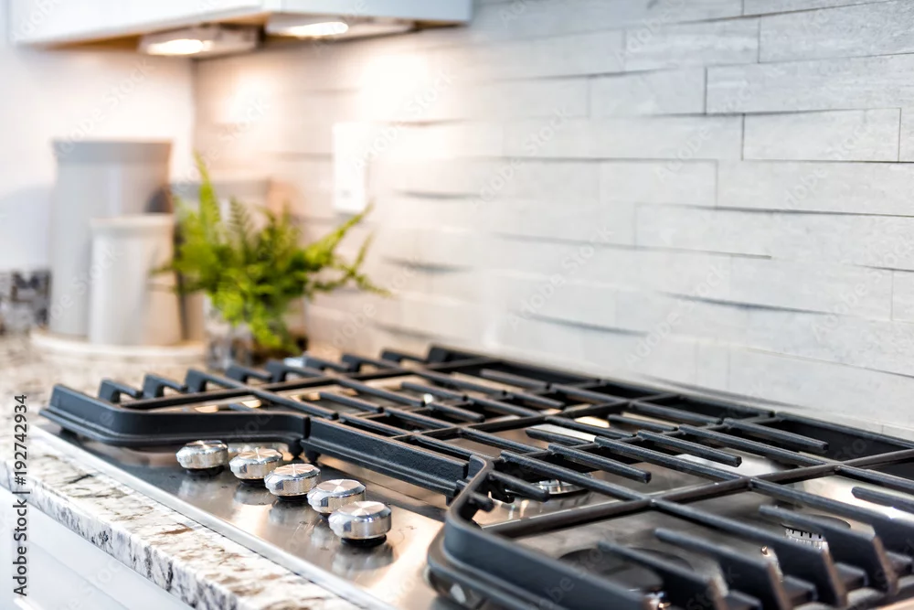 Macro closeup of modern luxury gas stove top with tiled backsplash