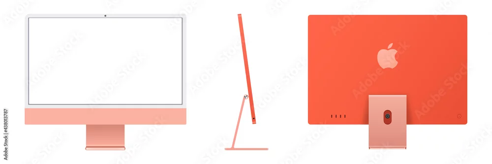 MAGELANG, INDONESIA - JUNE 7, 2021: iMac 2021 desktop. New iMac computer. Front, side and back view. Apple computer in orange. Vector illustration