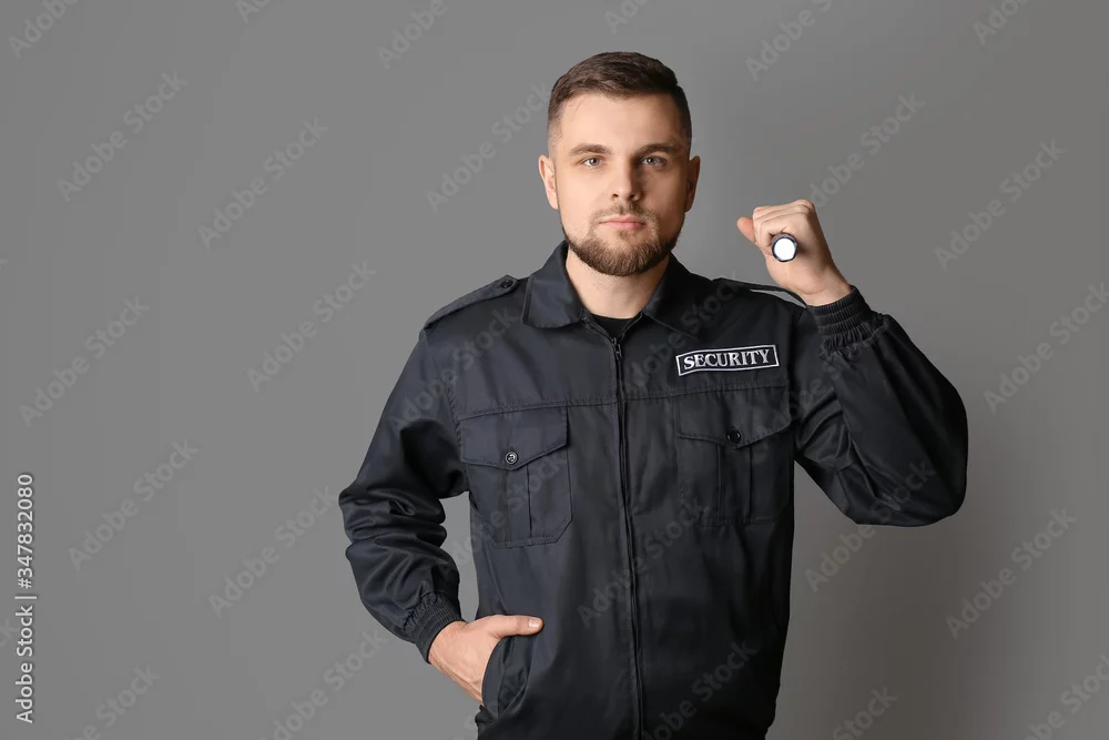 Male security guard with flashlight on grey background